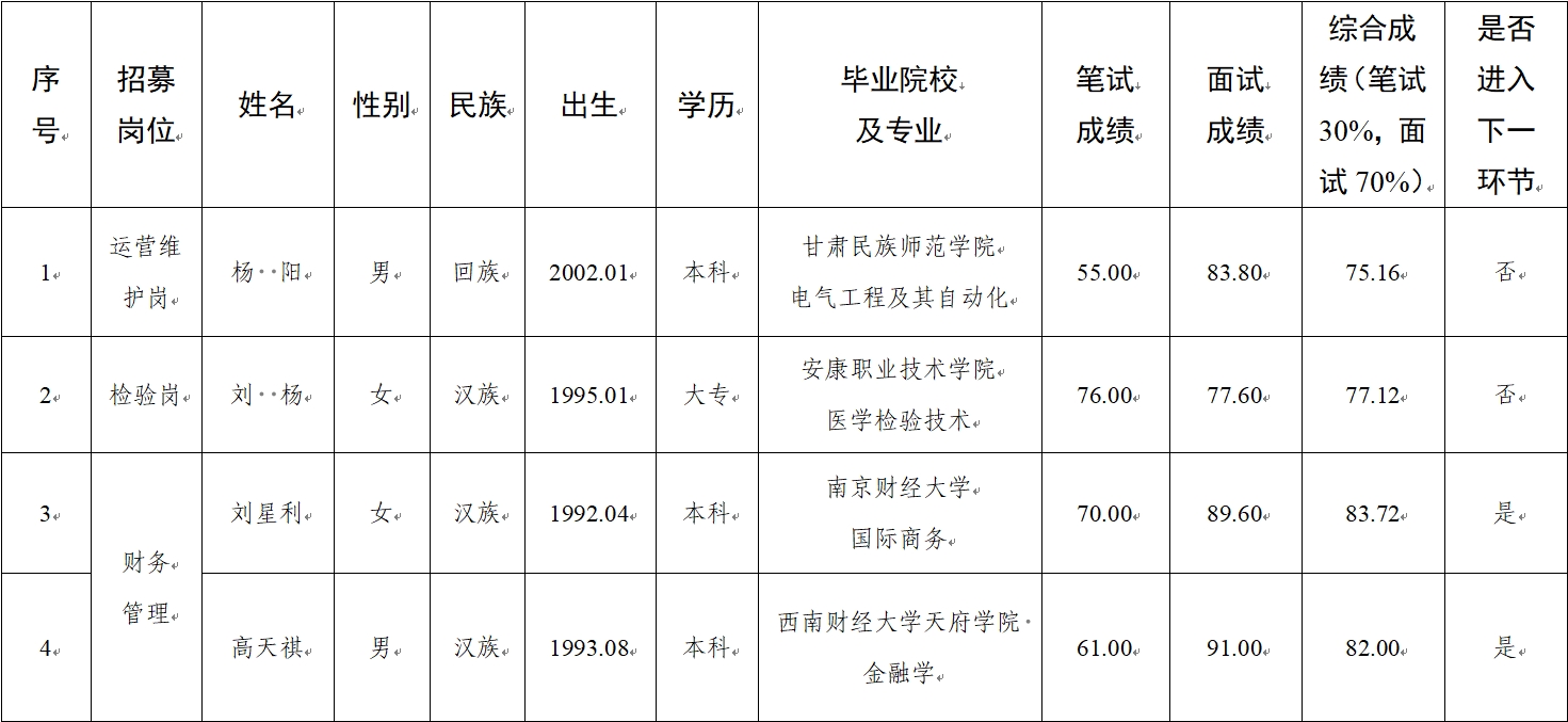 2025-03-26根据《甘肃水建工程开发有限公司2025年公开招聘特殊岗位工作人员公告》,在组织报名、资格审查的基础上,按程序完成了笔试、面试工作,现将笔试、面试成绩公示如下: &nbs